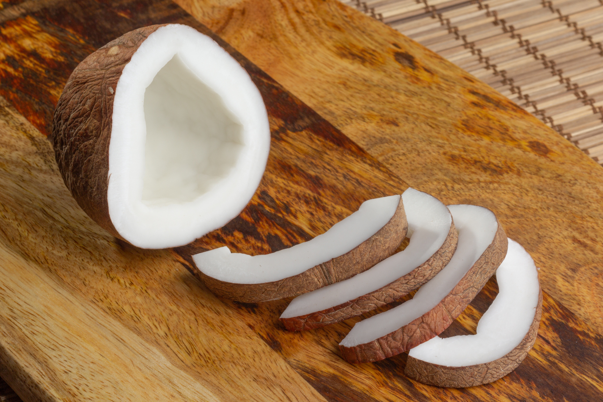 Whole coconut, halves, and slices for different channels.