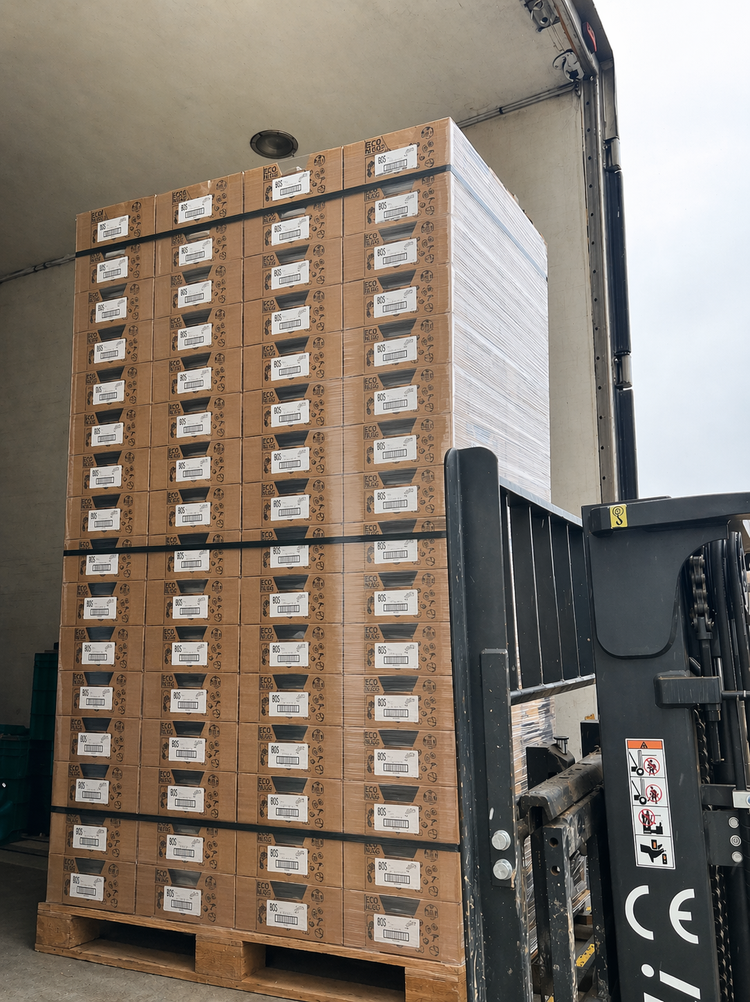 Our boxes are engineered to fit exactly 228 units per pallet across 19 rows at 2.05 m total height — built for safe, efficient transport and clean retail-ready presentation.